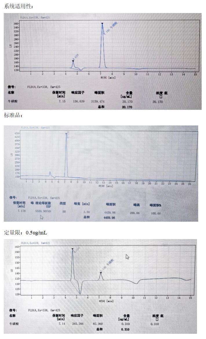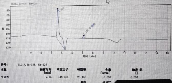 用牛磺酸標(biāo)樣做重現(xiàn)性實(shí)驗(yàn),用 20ug/mL 濃度的標(biāo)樣 6 針,其保留時(shí)間的相對(duì)標(biāo)準(zhǔn)偏差(RSD)是 0.062%, 峰面積的相對(duì)標(biāo)準(zhǔn)偏差(RSD)是 0.126%。