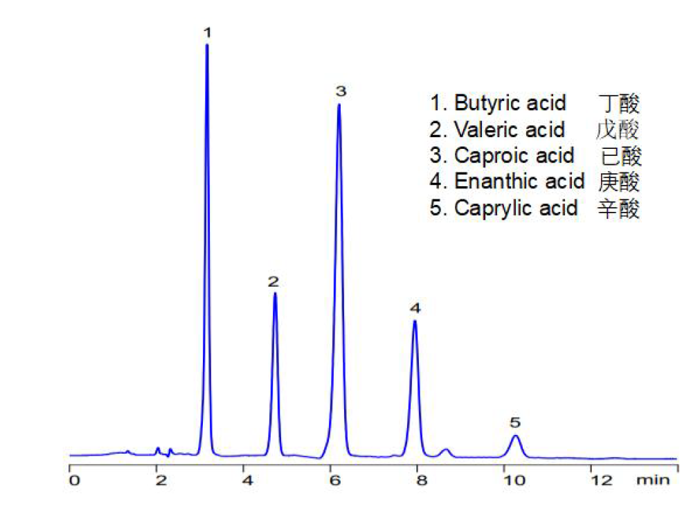 App ID: FLM-C250012 Comixsil RP-100 HPLC-UV 法直接分析有機(jī)酸-丁酸戊酸已酸庚酸辛酸 色譜柱:Comixsil RP-100 3μ 150x4.6mm 貨號:FMF-100R3-EONU 流速:1mL/min 檢測:UV 210nm 柱溫:25℃ 進(jìn)樣量:5μL 流動相:乙腈:水:硫酸(20%:75%:5%) 色譜圖: