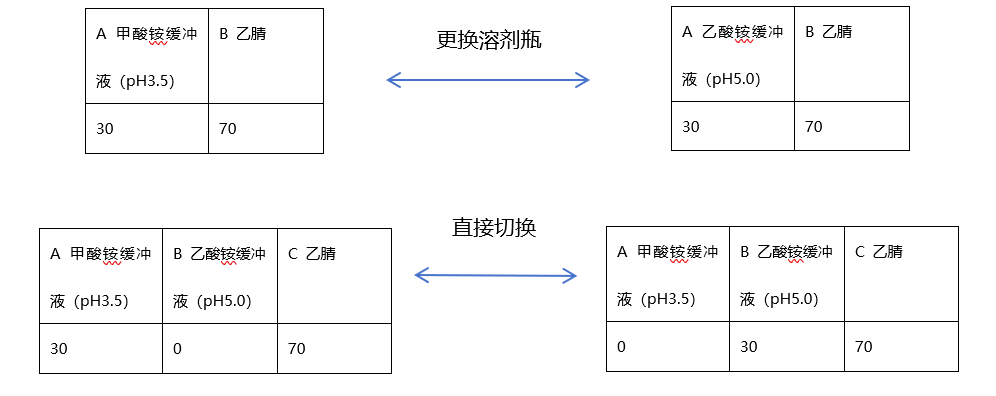 可以觀察到該梯度明顯不適用于示例1與示例2的方法,此時(shí)可以采用以下方法: A瓶:水-乙腈-1%甲酸水溶液=80-10-10 B瓶:水-乙腈-甲酸水溶液=50-30-20 可得二元泵梯度為
