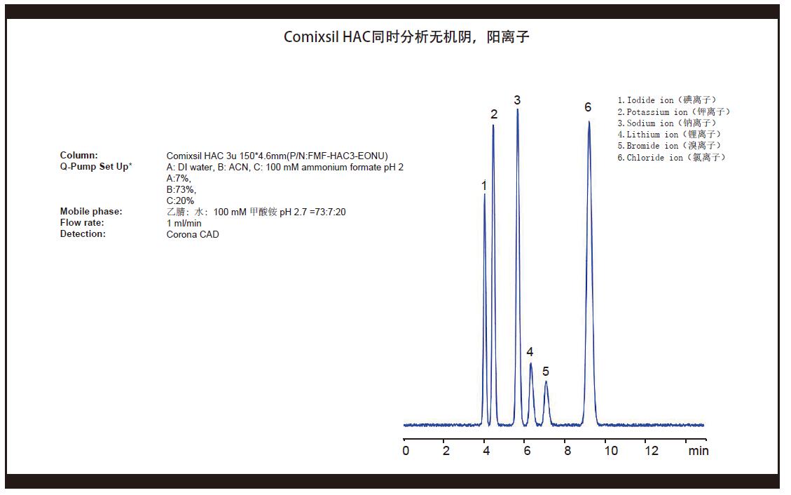 Comixsil HAC分離氨基糖苷類的鏈霉素與雙氫鏈霉素 Comixsil HAC分析8種氨基糖苷物質(zhì) Comixsil HAC分離11種核酸堿基與核苷(MS匹配) Comixsil HAC 液相方法分離鈣與鋅離子 Comixsil HAC同時(shí)分析鋅鈣銅等金屬離子及相應(yīng)的陰離子