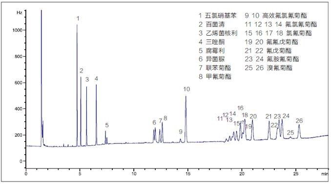 圖1 添加水平為0.2mg/kg大米中有機(jī)氯和擬除蟲菊酯類農(nóng)藥多殘留檢測色譜圖